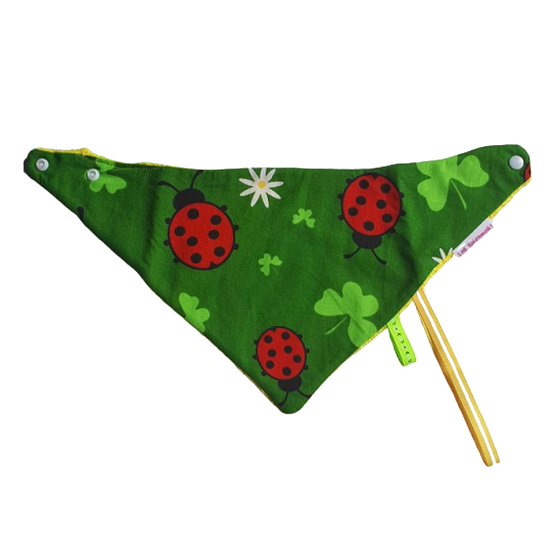 Een fleurige bandana kwijlslab met lieveheersbeestjes en klavertjes vier.