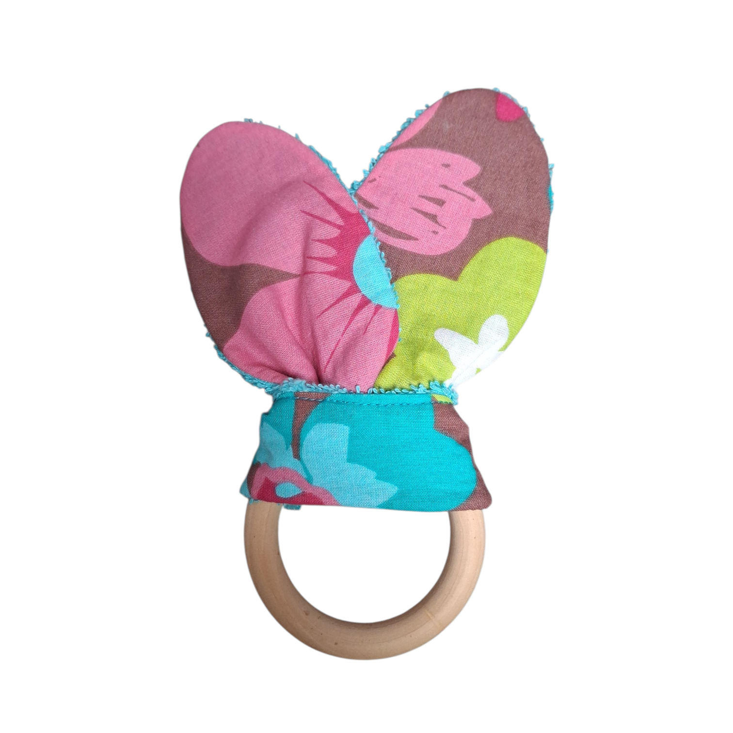 Houten bijtring met konijnoren van badstof en katoenenstof met bloemen.