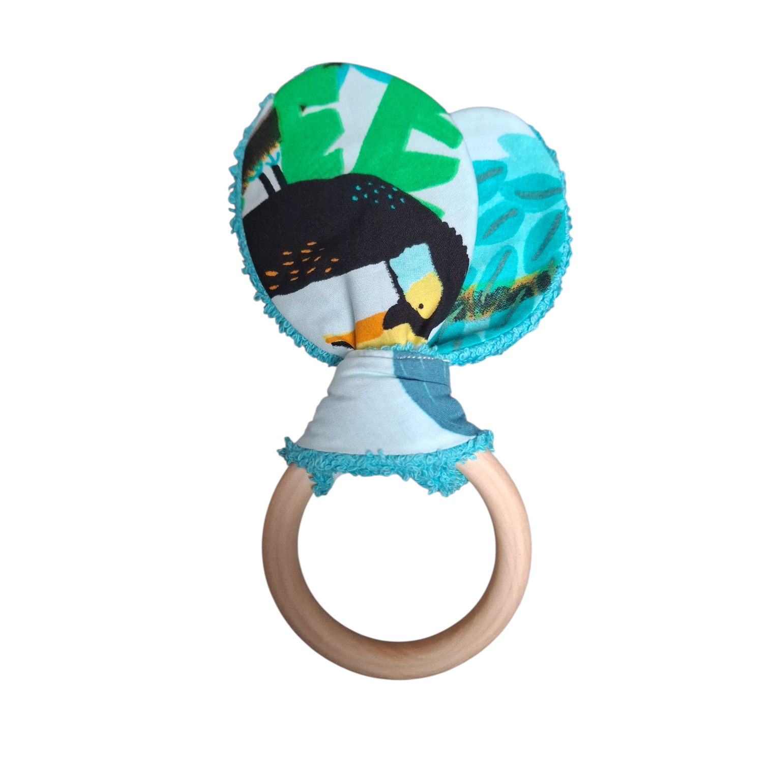 Houten bijtring met konijnenoren van katoenen stof met jungleprint.