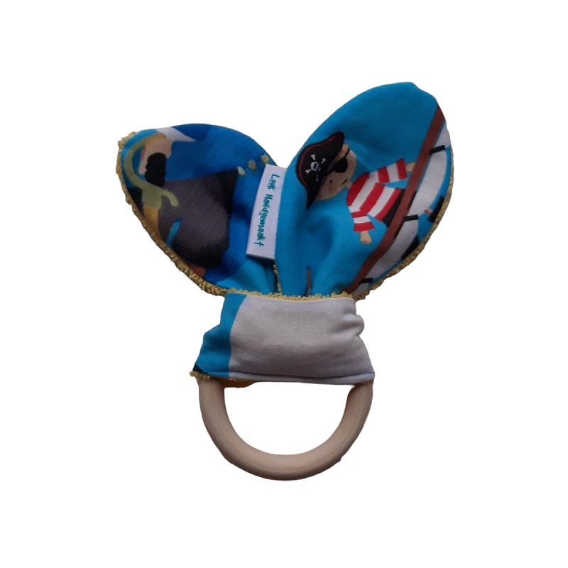 Houten bijtring met konijnoren van badstof en katoenenstof met piratenprint.