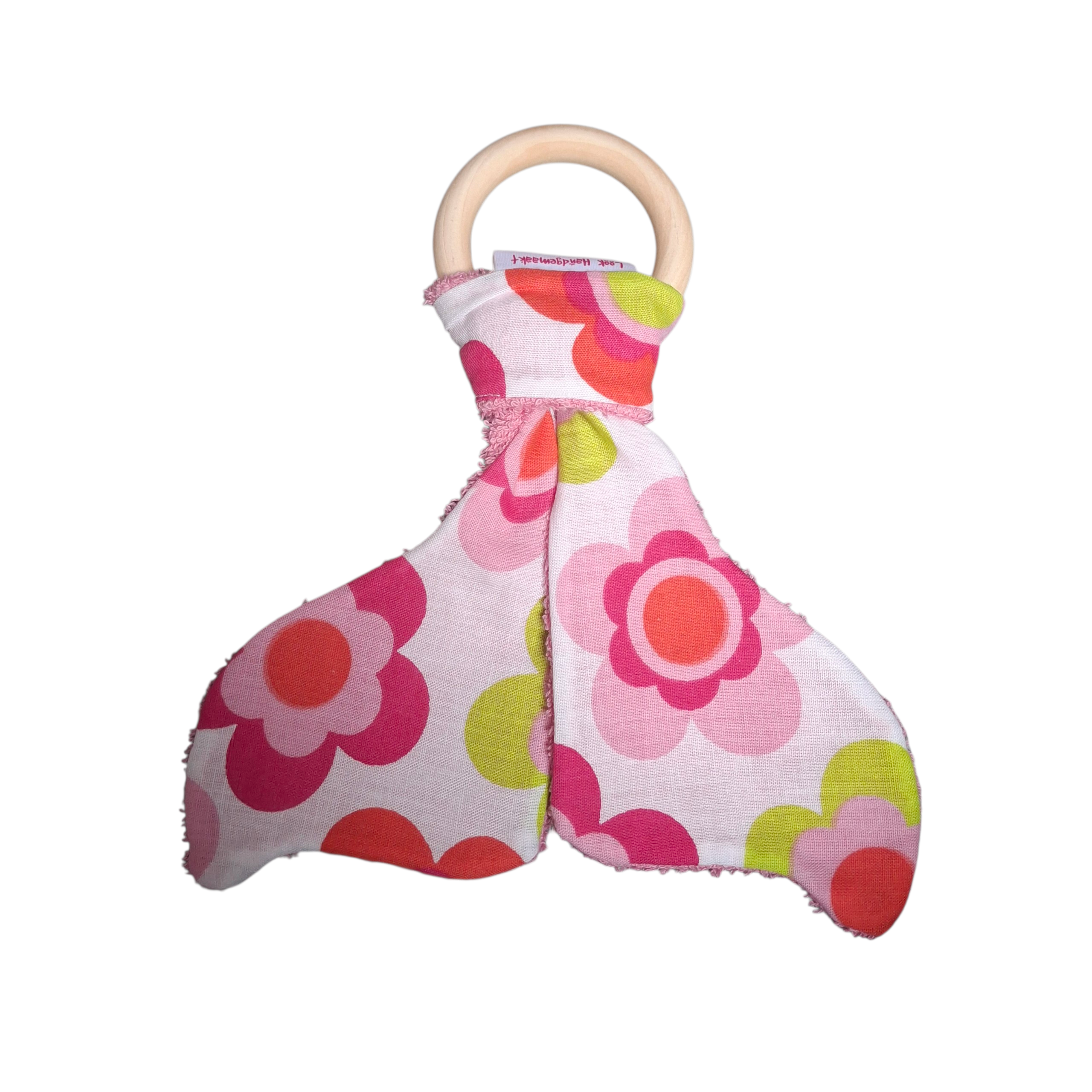 Houten bijtring met zeemeerminnenstaart van witte tkatoenenstof met bloemen en roze badstof.