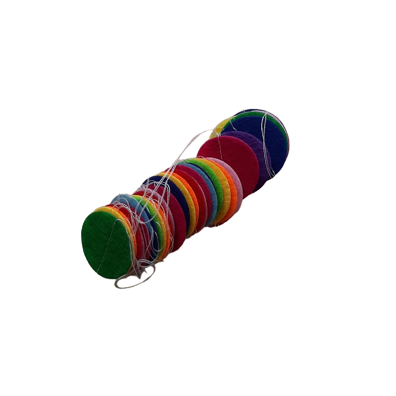 Vilten slinger met stippen (3cm) in diverse kleuren. D.m.v. wit naaigaren aan elkaar gemaakt met tussenruimte.