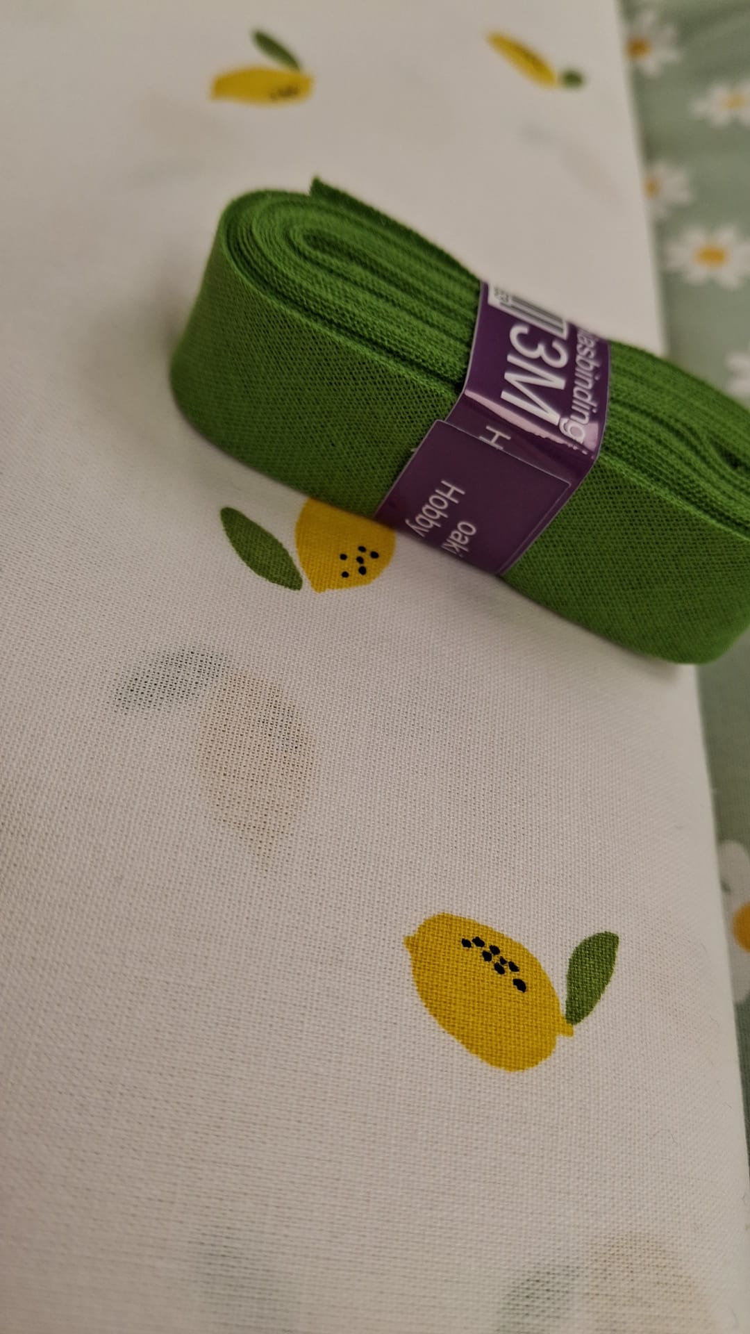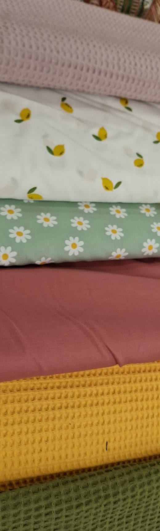 Wafelstof: Groen/Oudroze/Okergeel Citroen: Wit met citroen met blad Bloem: Mint groen met witte bloem Effen katoen: Oudroze