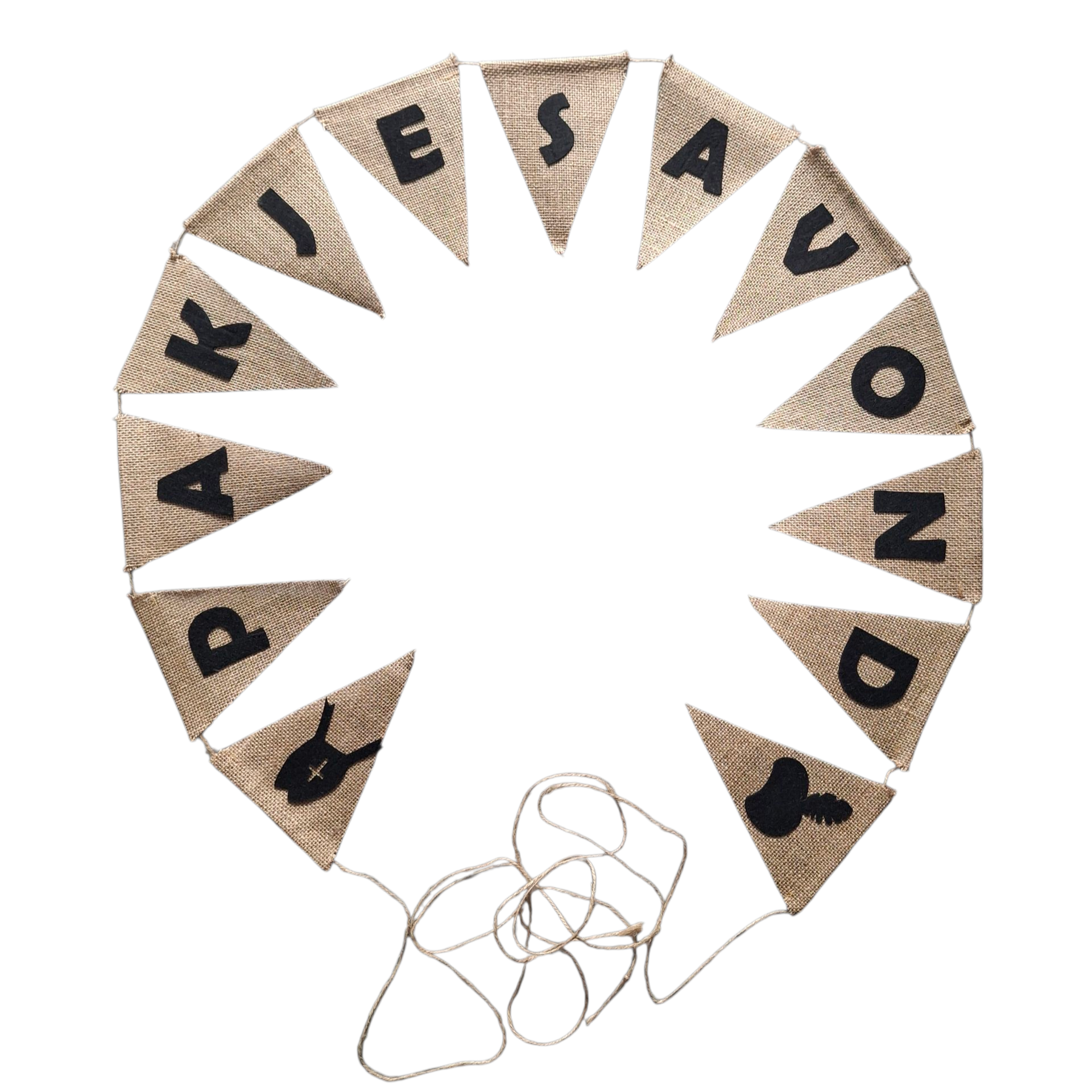 Jute vlaggenlijn met de tekst Pakjesavond. Aan beide zijden is een afbeelding bevestigd. Op deze vlaggenlijn staat een mijter en een pietenmuts.