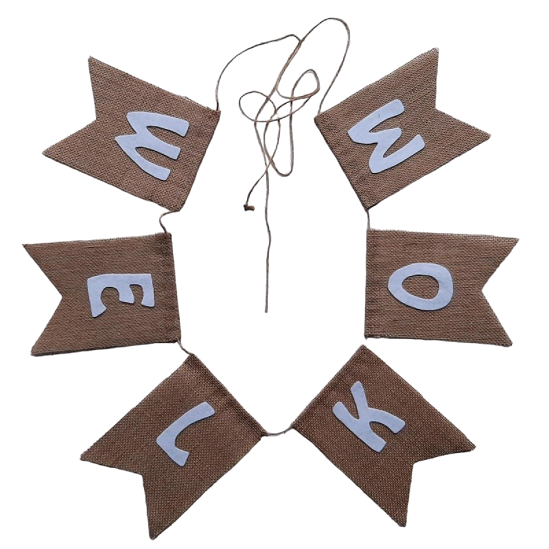 Bestaande uit twee losse vlaggenlijnen gemaakt van jute. Op de eerste vlaggenlijn staat Welkom. Op de tweede vlaggenlijn staat een afbeelding van een mijter, tekst Sint & tekst Piet en een afbeelding van een pietenmuts.